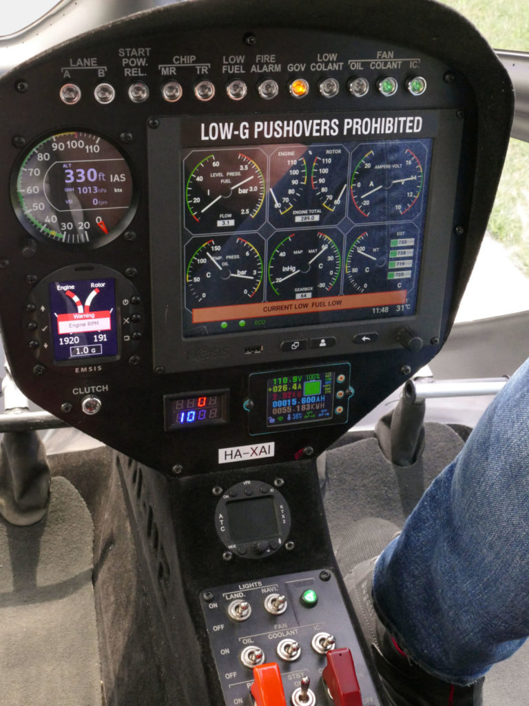 Auf dem Instrumentenpilz dominiert der Bildschirm des Nesis III von Kanardia. Das System vereint EFIS, EMS und Navigation – auch die Integration eines Autopiloten ist grundsätzlich möglich. Links daneben sitzen der elektronische Fahrtmesser sowie der hubschraubertypische Dualtacho. Am oberen Panelrand sind zwölf deutlich beschriftete Warnlampen platziert, die teilweise zusätzlich mit akustischen Signalen oder Sprachausgaben gekoppelt sind. Kritische Zustände bei Temperaturen, Drehzahlen, Füllständen und so weiter sollten der Crew so nicht entgehen.