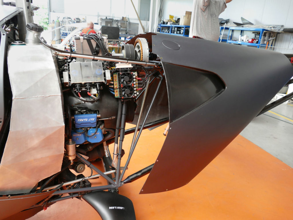 Aus dem geöffneten Motorraum leuchten uns die hellblauen Ventildeckel des Rotax 915 iS und die beiden silberfarbenen Metalltanks entgegen. Einer der Tanks kann mit wenigen Handgriffen um 90 Grad gedreht werden, um so die veränderte Schwerpunktlage im Solobetrieb auszugleichen.