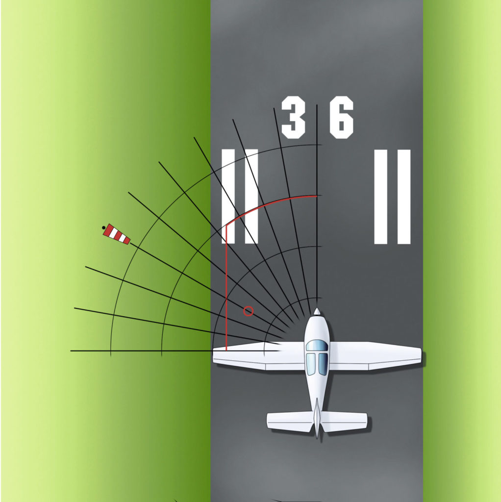 Da das Flugzeug dabei vom Boden aus betrachtet, wie eine seitwärts laufende Krabbe aussieht, wird diese Technik im Englischen häufig auch als »Crabbing« bezeichnet. Schon beim Eindrehen in den Endanflug sollte der Seitenwind bedacht werden: Entsprechend muss man die Kurve etwas früher oder später beginnen, um ohne großen Korrekturbedarf in der Bahnachse zu landen.